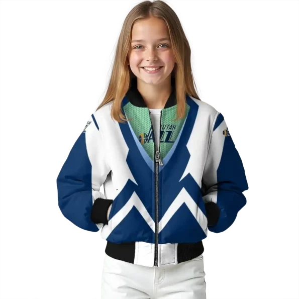 Uncover the details that make this Personalized Utah Jazz V Stripes Navy White Bomber Jacket a truly exceptional piece.