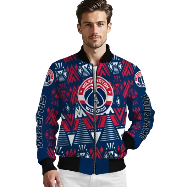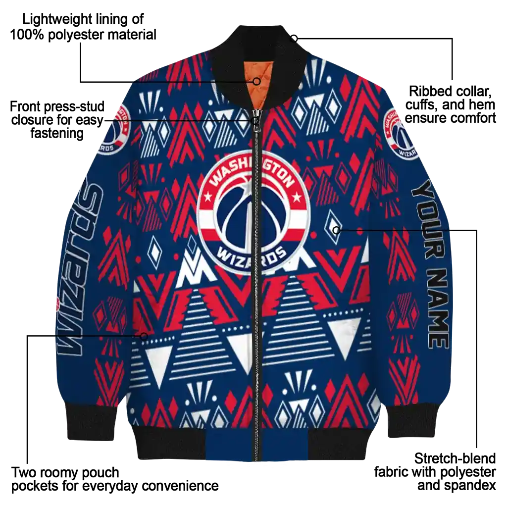 Uncover the details that make this Customized Washington Wizards Pyramid Shapes Blue Bomber Jacket a truly exceptional piece.